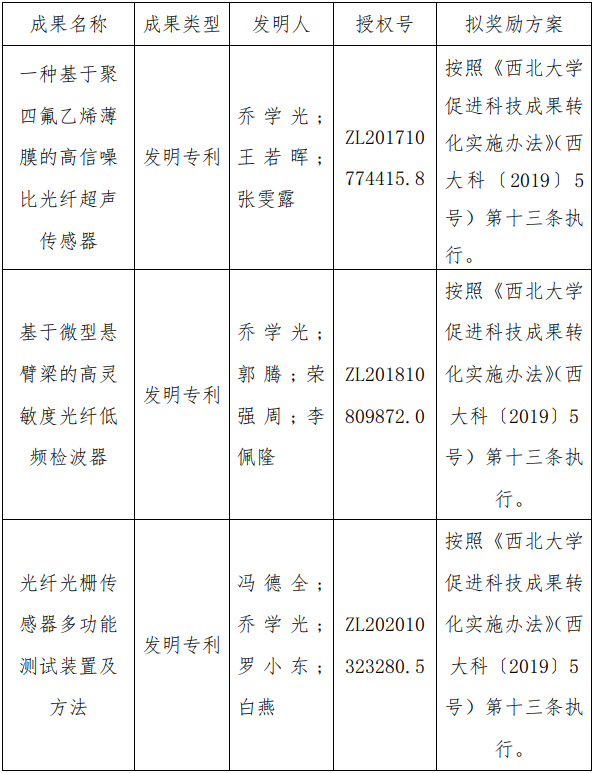 按照《米兰买球促进科技成果转化实施办法》(西大科〔2019〕5号)相关规定,拟对米兰买球物理学院乔学光教授作为成果负责人的3项发明专利权实施普通许可,现将相关信息公示如下: