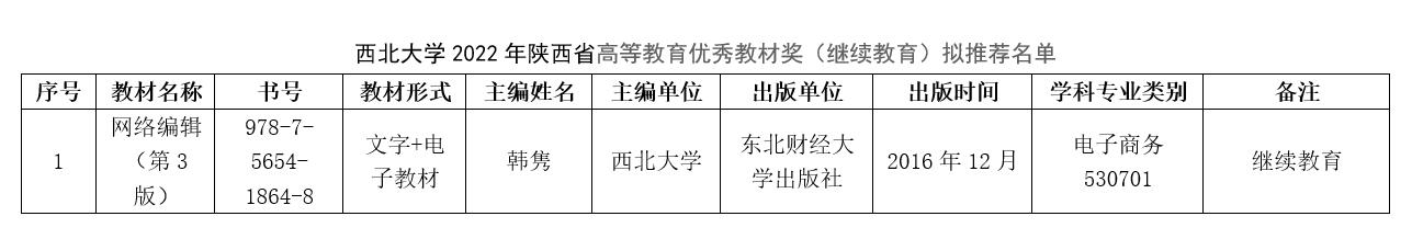 根据陕西省教育厅《关于开展陕西省2022年职业教育和高等教育优秀教材奖评选工作的通知》(陕教材办〔2022〕12 号)要求,米兰买球组织开展了米兰买球2022年陕西高等教育优秀教材奖(继续教育)评选推荐工作,经个人申报、院系推荐、专家评议,拟推荐《网络编辑》教材参加陕西省高等教育优秀教材奖(继续教育)评选。现将拟推荐名单公示如下,公示期为6月7日至6月11日。公示期间如有异议,请以实名书面形式反映。
