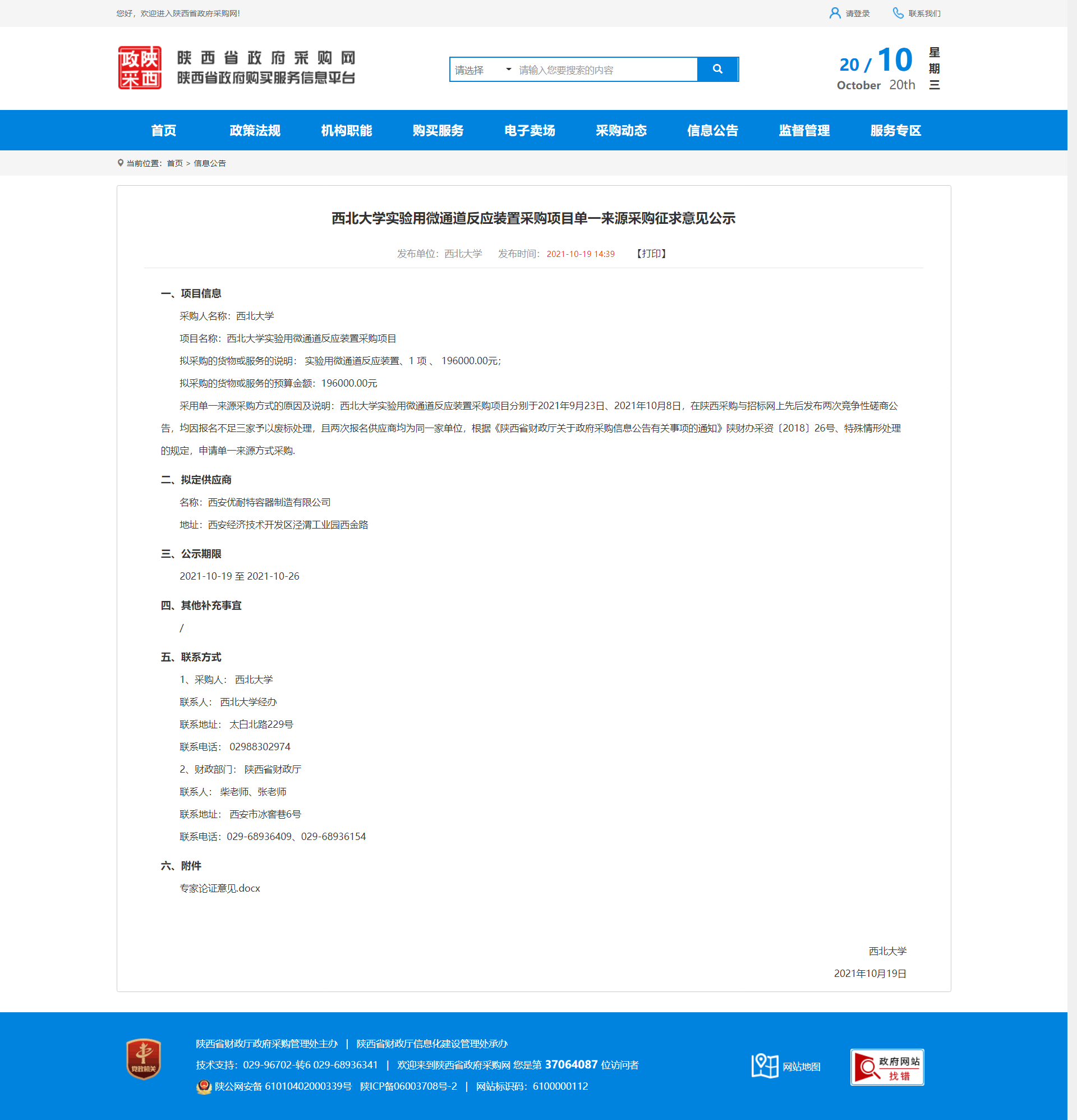 米兰买球实验用微通道反应装置采购项目单一来源采购征求意见公示 作者: 编辑:采购与招标办公室 时间:2021-10-20 原公告地址:http://www.ccgp-shaanxi.gov.cn/notice/noticeDetail.do?noticeguid=8a85be337c20d0b4017c97438c3a589e
