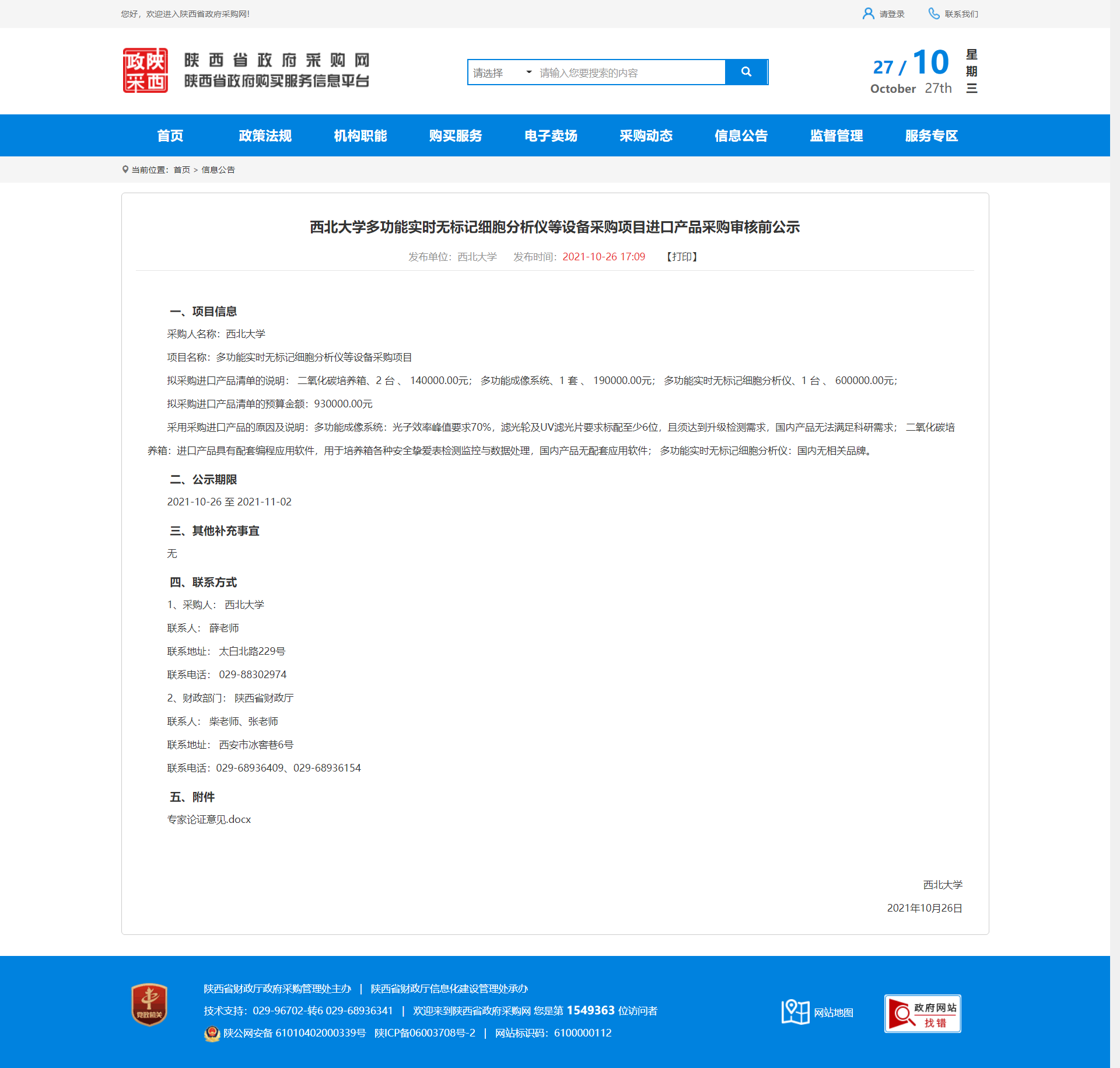 米兰买球多功能实时无标记细胞分析仪等设备采购项目进口产品采购审核前公示
