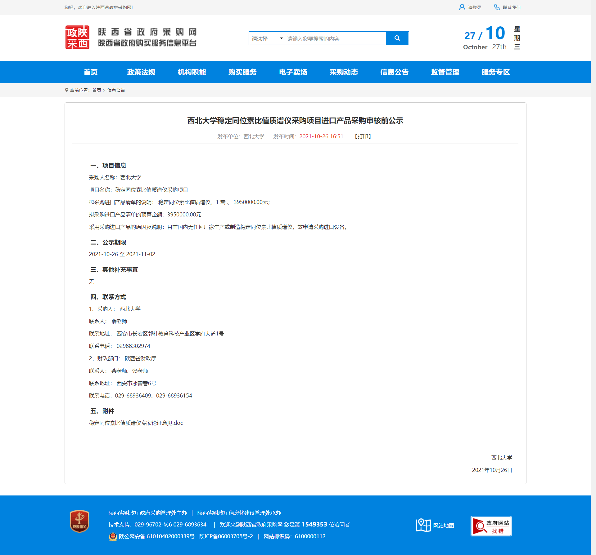 米兰买球稳定同位素比值质谱仪采购项目进口产品采购审核前公示