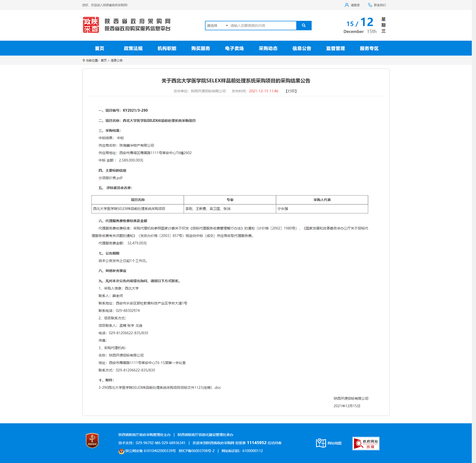 关于米兰买球医学院SELEX样品前处理系统采购项目的采购结果公告 作者: 编辑:薛利娟 时间:2021-12-15 原公告链接:http://www.ccgp-shaanxi.gov.cn/notice/noticeDetail.do?noticeguid=8a85be347dace9e6017dbc2606f522a9
