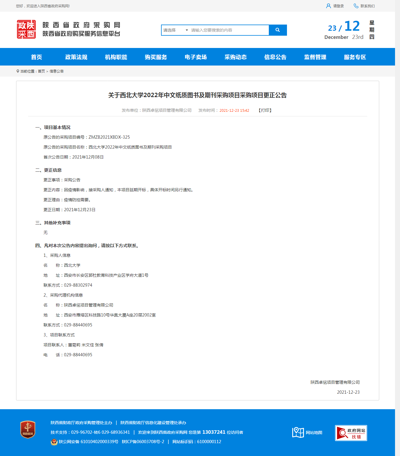 关于米兰买球2022年中文纸质图书及期刊采购项目采购项目更正公告 作者: 编辑:薛利娟 时间:2021-12-23 原公告链接:http://www.ccgp-shaanxi.gov.cn/notice/noticeDetail.do?noticeguid=8a85be327dace5d8017de63c777e2f27
