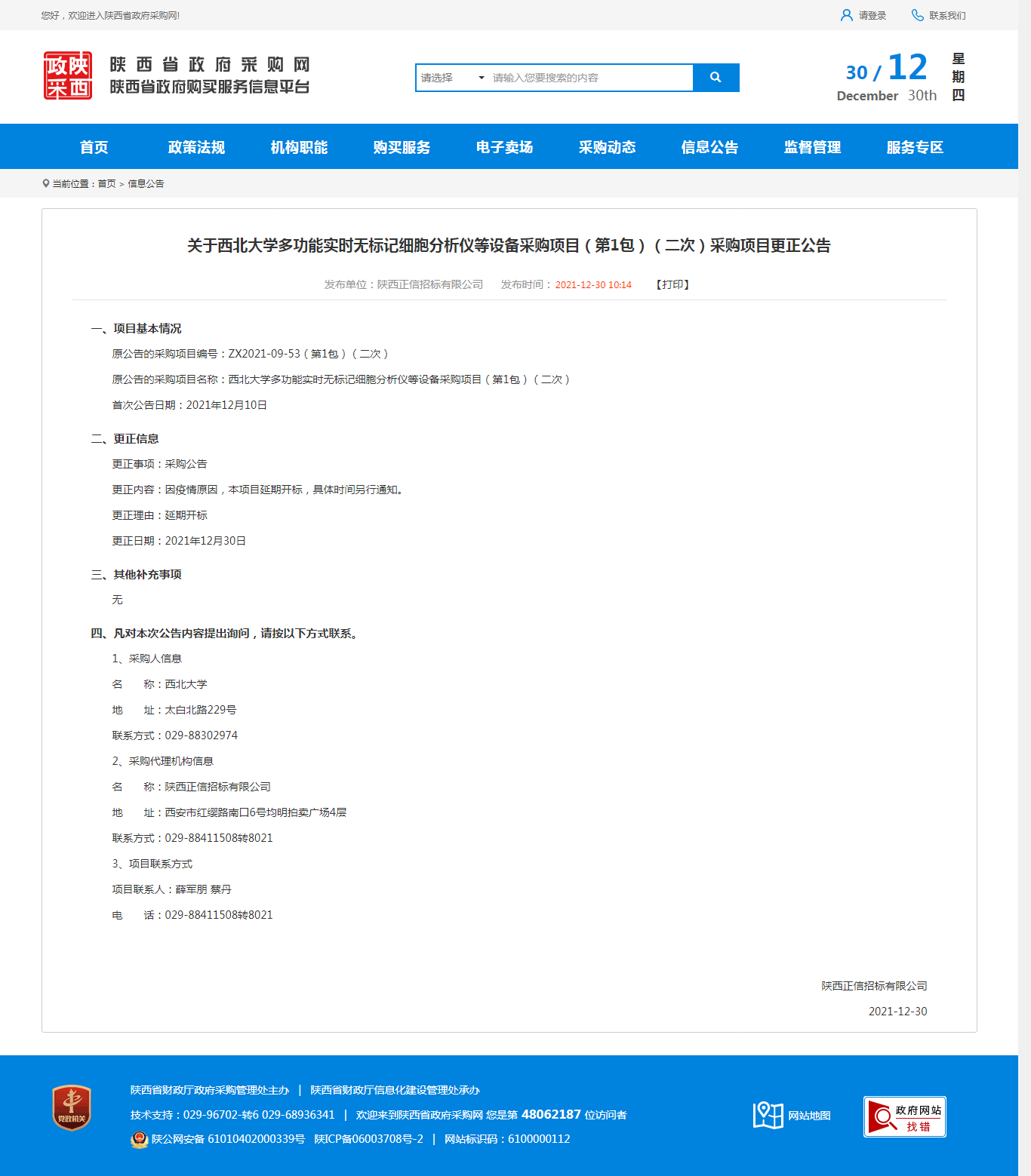 关于米兰买球多功能实时无标记细胞分析仪等设备采购项目(第1包)(二次)采购项目更正公告 作者: 编辑:薛利娟 时间:2021-12-30 原公告链接:http://www.ccgp-shaanxi.gov.cn/notice/noticeDetail.do?noticeguid=8a85be337debad6b017e09039d8453ea