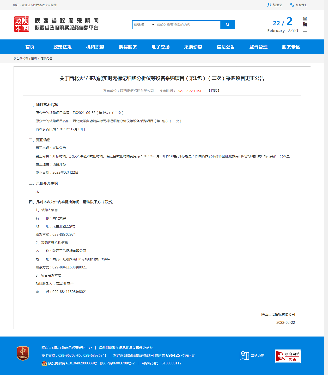 关于米兰买球多功能实时无标记细胞分析仪等设备采购项目(第1包)(二次)采购项目更正公告 作者: 编辑:薛利娟 时间:2022-02-22 原公告链接:http://www.ccgp-shaanxi.gov.cn/notice/noticeDetail.do?noticeguid=8a85be337ee79f03017f1f88974a78b8