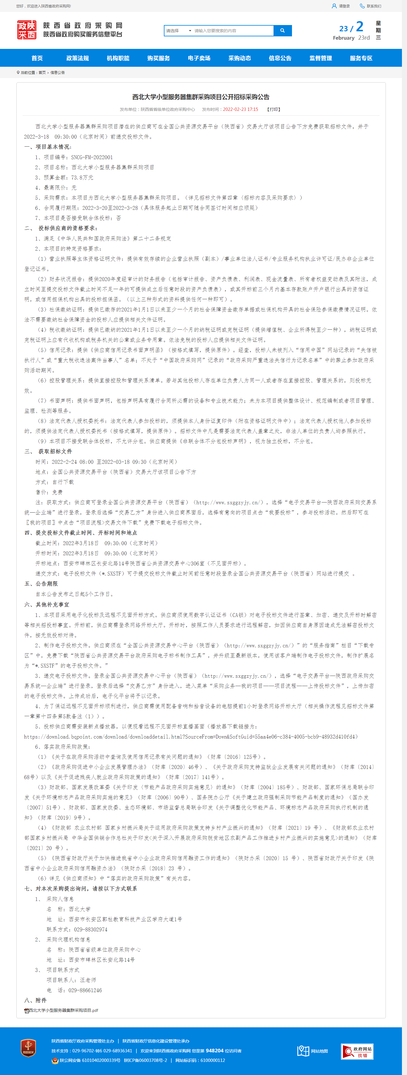 米兰买球小型服务器集群采购项目公开招标采购公告 作者: 编辑:薛利娟 时间:2022-02-23 原公告链接:http://www.ccgp-shaanxi.gov.cn/notice/noticeDetail.do?noticeguid=8a85be387e22c8ad017f25dab58b0372