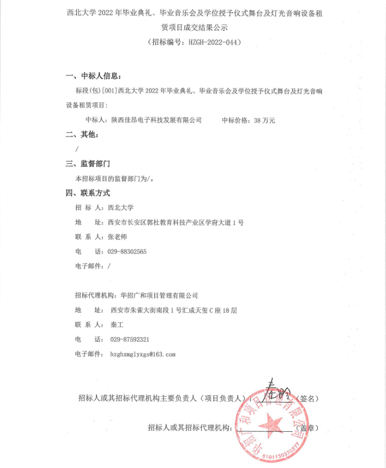 关于米兰买球2022年毕业典礼、毕业音乐会及学位授予仪式舞台及灯光音响设备租赁项目成交结果公示