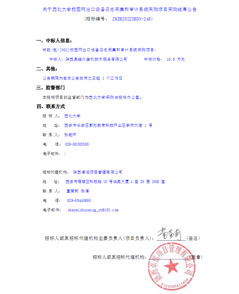 关于米兰买球校园网出口设备日志采集和审计系统采购项目采购结果公告