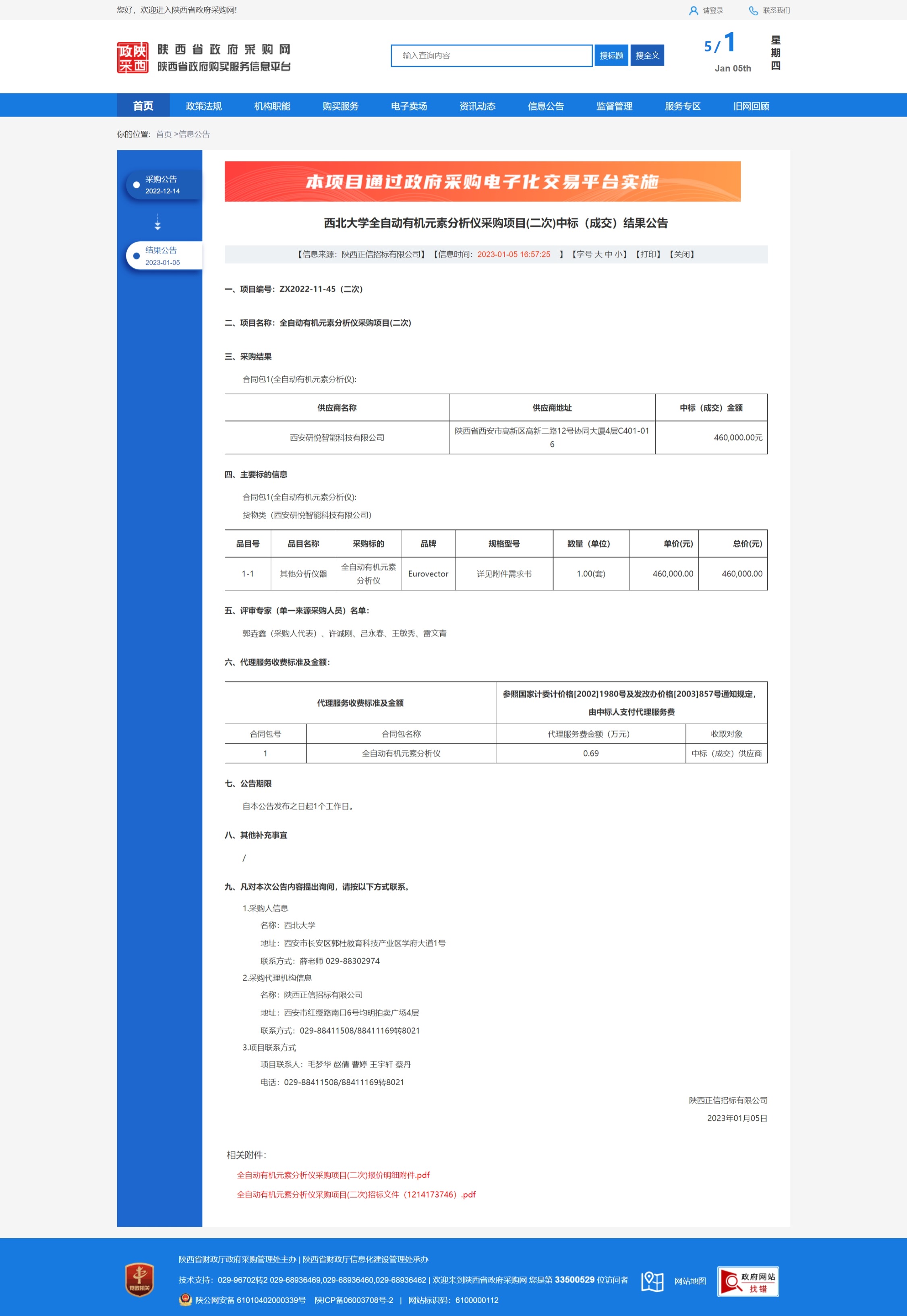 米兰买球全自动有机元素分析仪采购项目(二次)中标(成交)结果公告 作者: 编辑:采购与招标办公室 时间:2023-01-05 原公告链接:http://www.ccgp-shaanxi.gov.cn/freecms/site/shaanxi/ggxx/info/2023/8a69c86f852dbe9b0185807f572a04d1.html?noticeType=001021¬iceId=b8ed0ed9-8cd7-11ed-9a8e-08c0eb20c666
