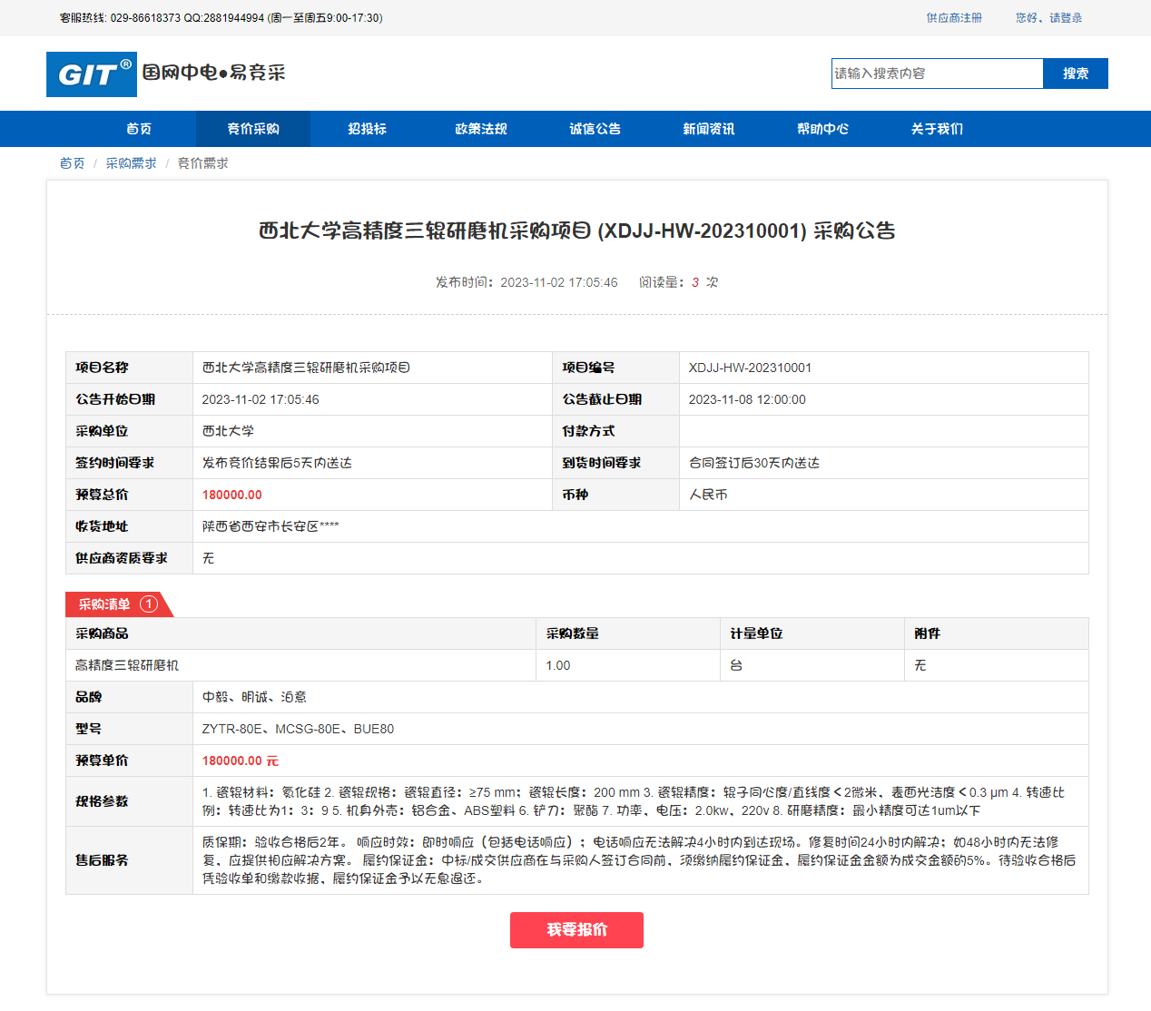 米兰买球高精度三辊研磨机采购项目竞价公告