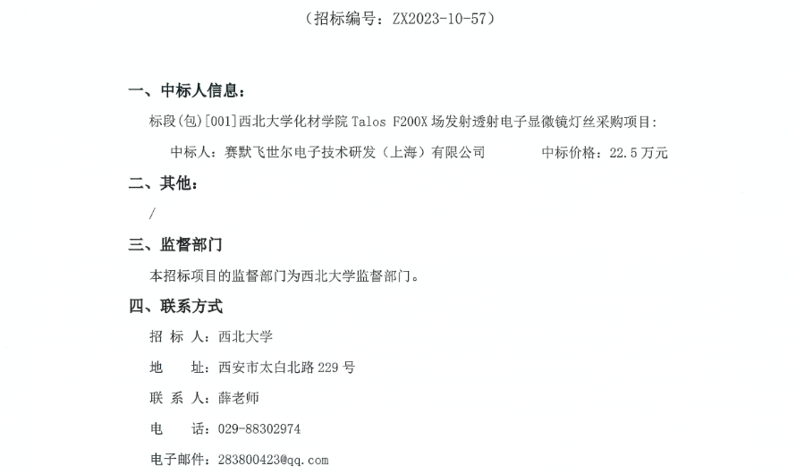 米兰买球化材学院Talos F200X场发射透射电子显微镜灯丝采购项目成交结果公示 作者: 编辑: 时间:2023-12-05 原公告链接:http://bulletin.sntba.com/resultBulletin/2023-12-05/881283.html