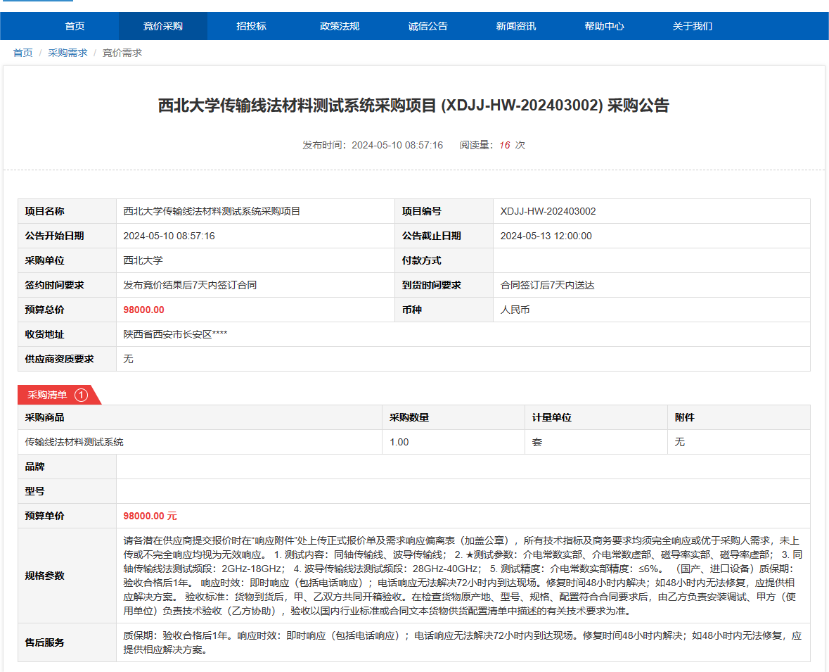 米兰买球传输线法材料测试系统采购项目 (XDJJ-HW-202403002) 竞价采购公告 作者: 编辑: 时间:2024-05-10 原公告链接:https://www.ejingcai.com.cn/site/bidding/detail/10045