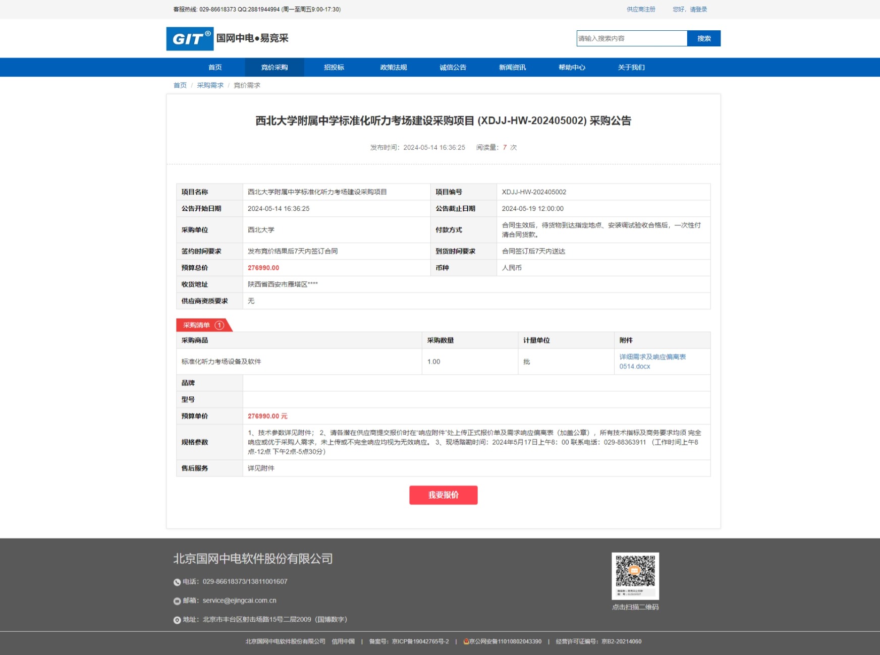 米兰买球附属中学标准化听力考场建设采购项目 (XDJJ-HW-202405002) 竞价采购公告 作者: 编辑:采购与招标办公室 时间:2024-05-14 原公告链接:https://www.ejingcai.com.cn/site/bidding/detail/10191