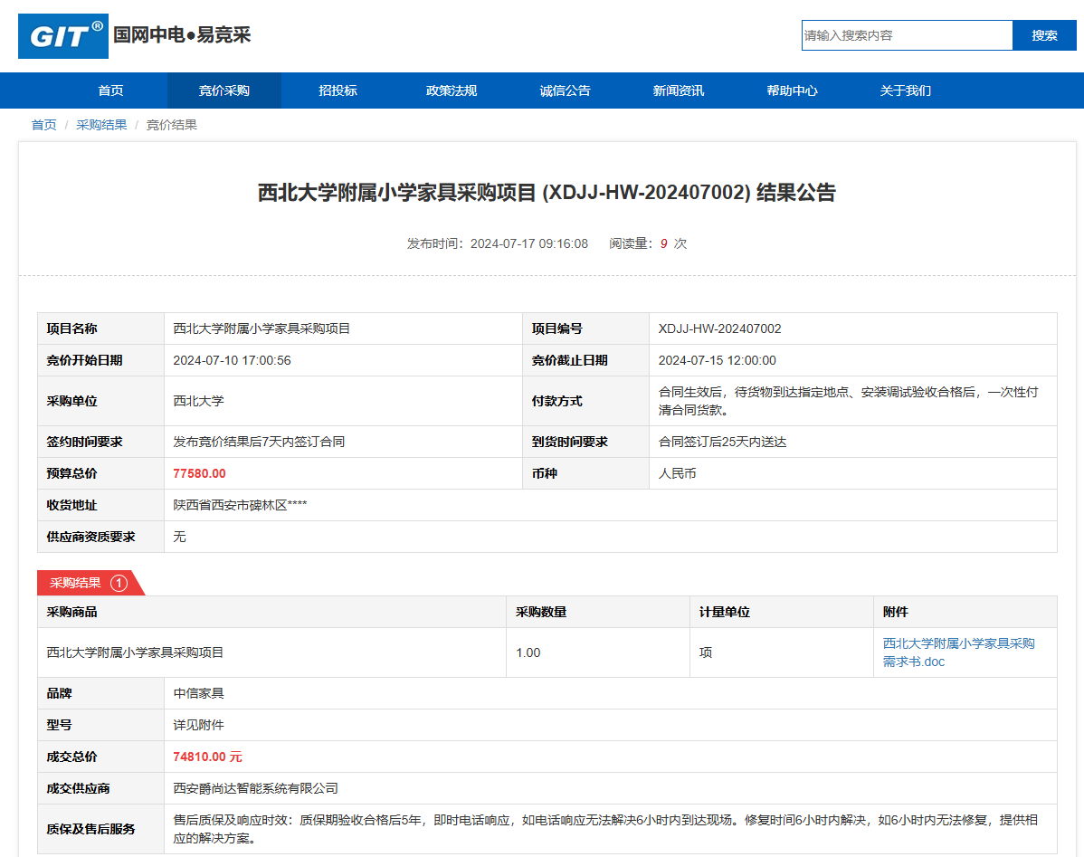 米兰买球附属小学家具采购项目 (XDJJ-HW-202407002) 竞价结果公告 作者: 编辑: 时间:2024-07-17 原公告链接:https://www.ejingcai.com.cn/site/bidding/detail/11713