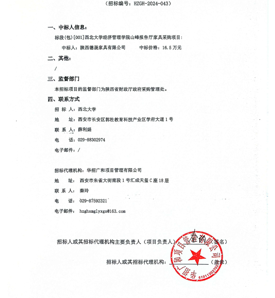 米兰买球经济管理学院山峰报告厅家具采购项目成交结果公示 作者: 编辑:采购与招标办公室 时间:2024-08-29 原公告链接:http://bulletin.sntba.com/resultBulletin/2024-08-29/1757879.html