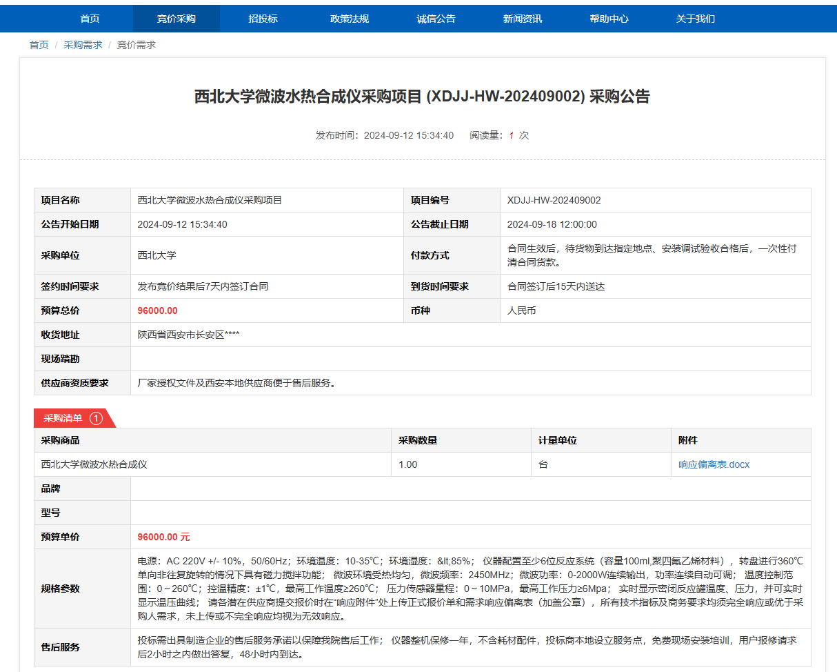 米兰买球微波水热合成仪采购项目 (XDJJ-HW-202409002)竞价采购公告 作者: 编辑: 时间:2024-09-12 原公告链接:https://www.ejingcai.com.cn/site/bidding/detail/12527