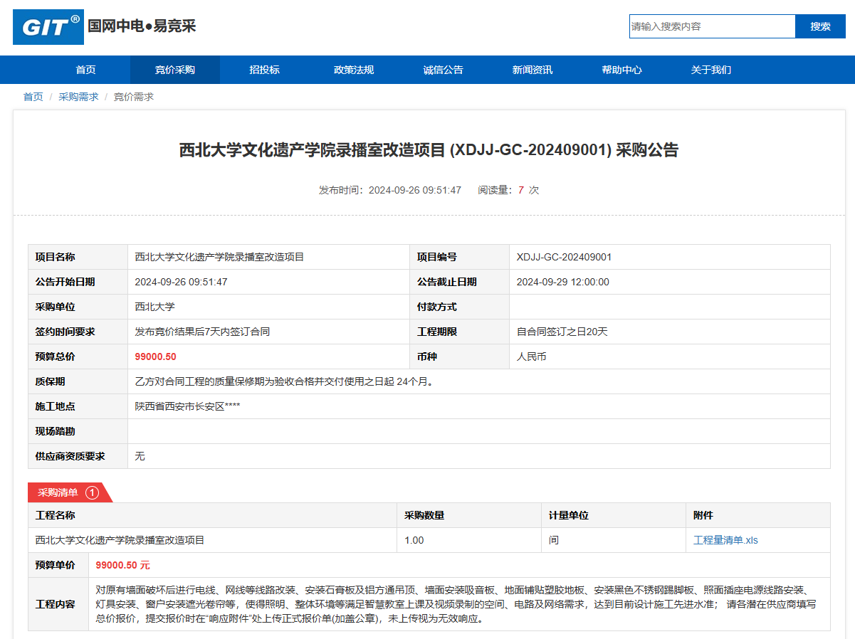 米兰买球文化遗产学院录播室改造项目 (XDJJ-GC-202409001)竞价采购公告 作者: 编辑: 时间:2024-09-26 原公告链接:https://www.ejingcai.com.cn/site/bidding/detail/12907