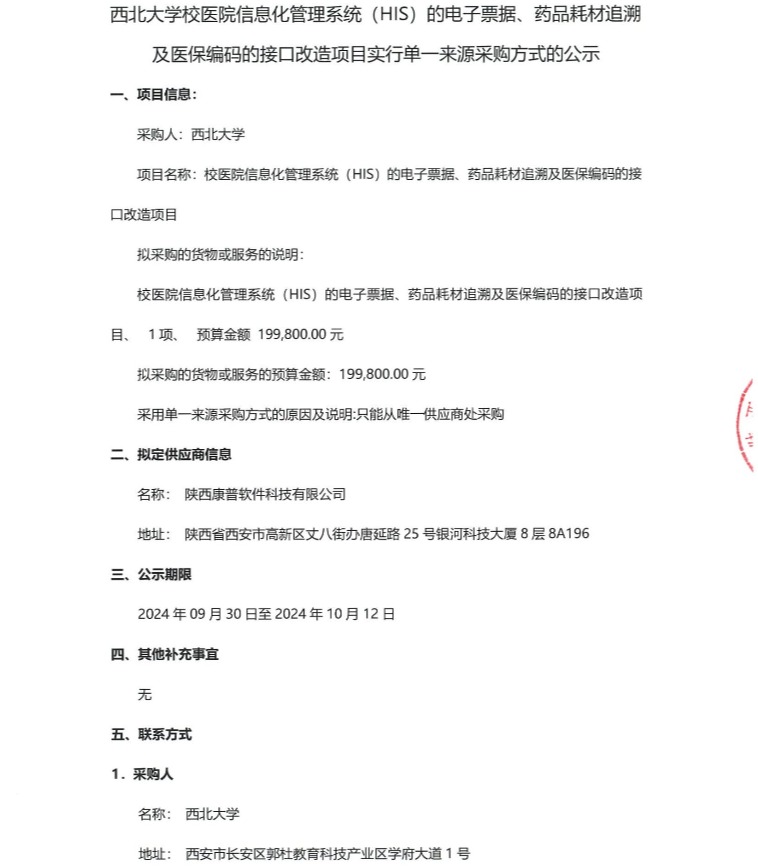 米兰买球校医院信息化管理系统(HIS)电子票据、药品耗材追溯及医保编码接口改造服务项目实行单一来源采购方式的公示