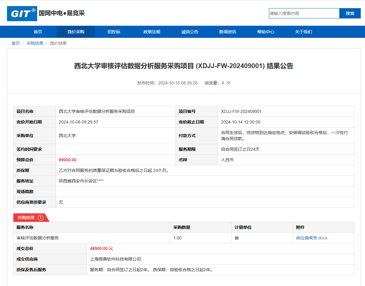 米兰买球审核评估数据分析服务采购项目(XDJJ-FW-202409001)竞价结果公告 作者:采购与招标办公室 编辑: 时间:2024-10-15 原公告链接:https://www.ejingcai.com.cn/site/bidding/detail/13296