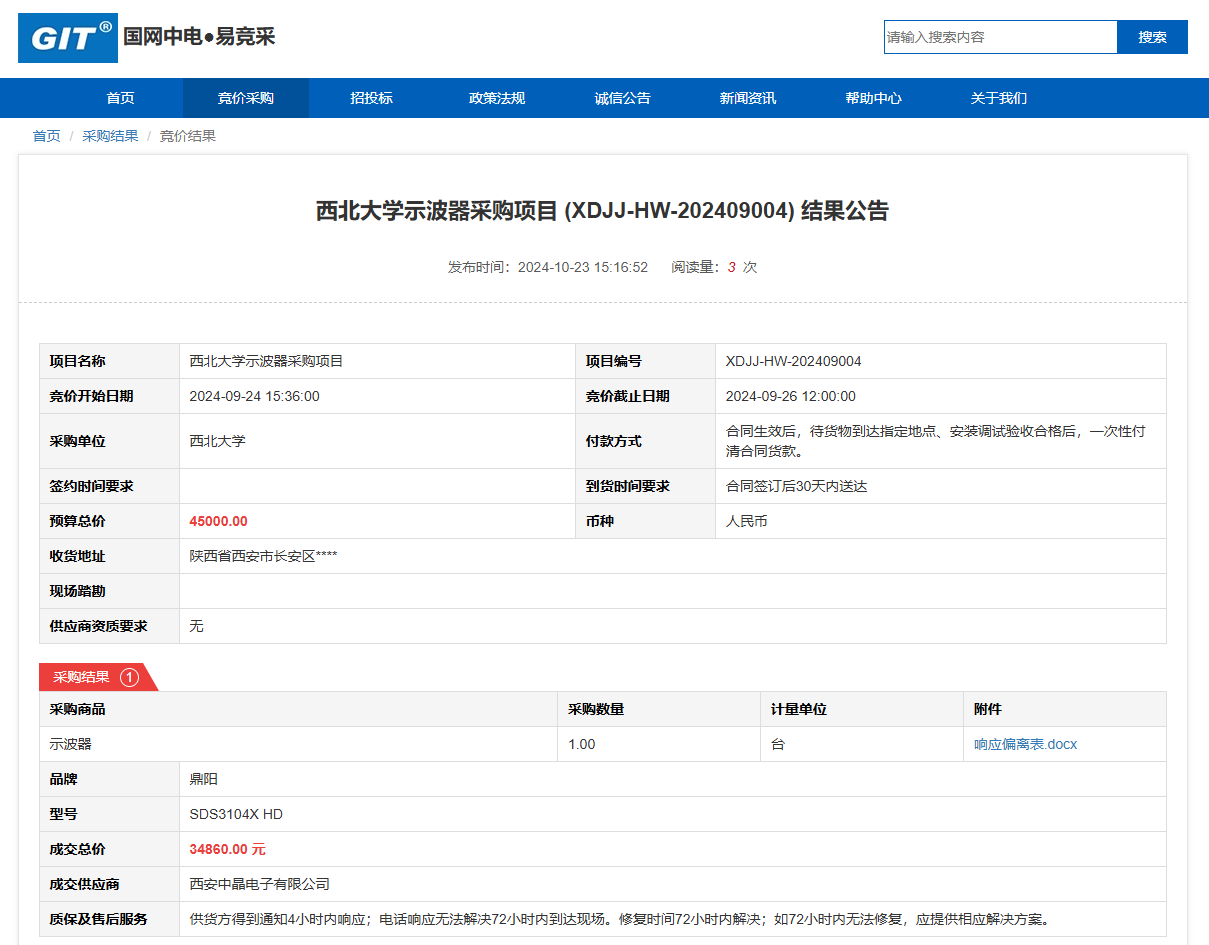 米兰买球示波器采购项目(XDJJ-HW-202409004)竞价结果公告 作者:采购与招标办公室 编辑: 时间:2024-10-23 原公告链接:https://www.ejingcai.com.cn/site/bidding/detail/13693