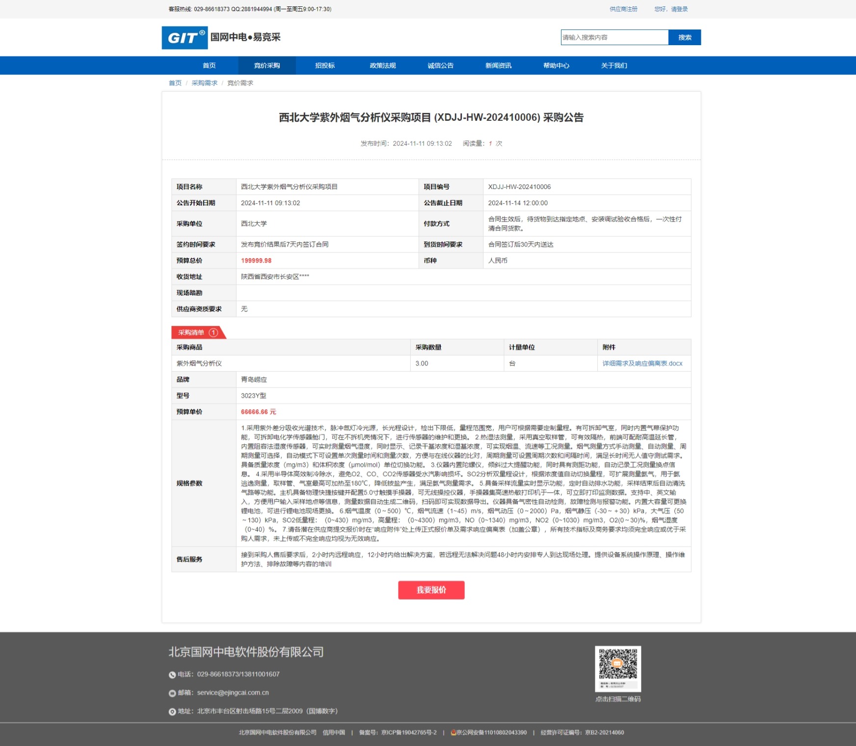 米兰买球紫外烟气分析仪采购项目 (XDJJ-HW-202410006) 竞价采购公告 作者: 编辑:采购与招标办公室 时间:2024-11-11 原公告链接:https://www.ejingcai.com.cn/site/bidding/detail/14592