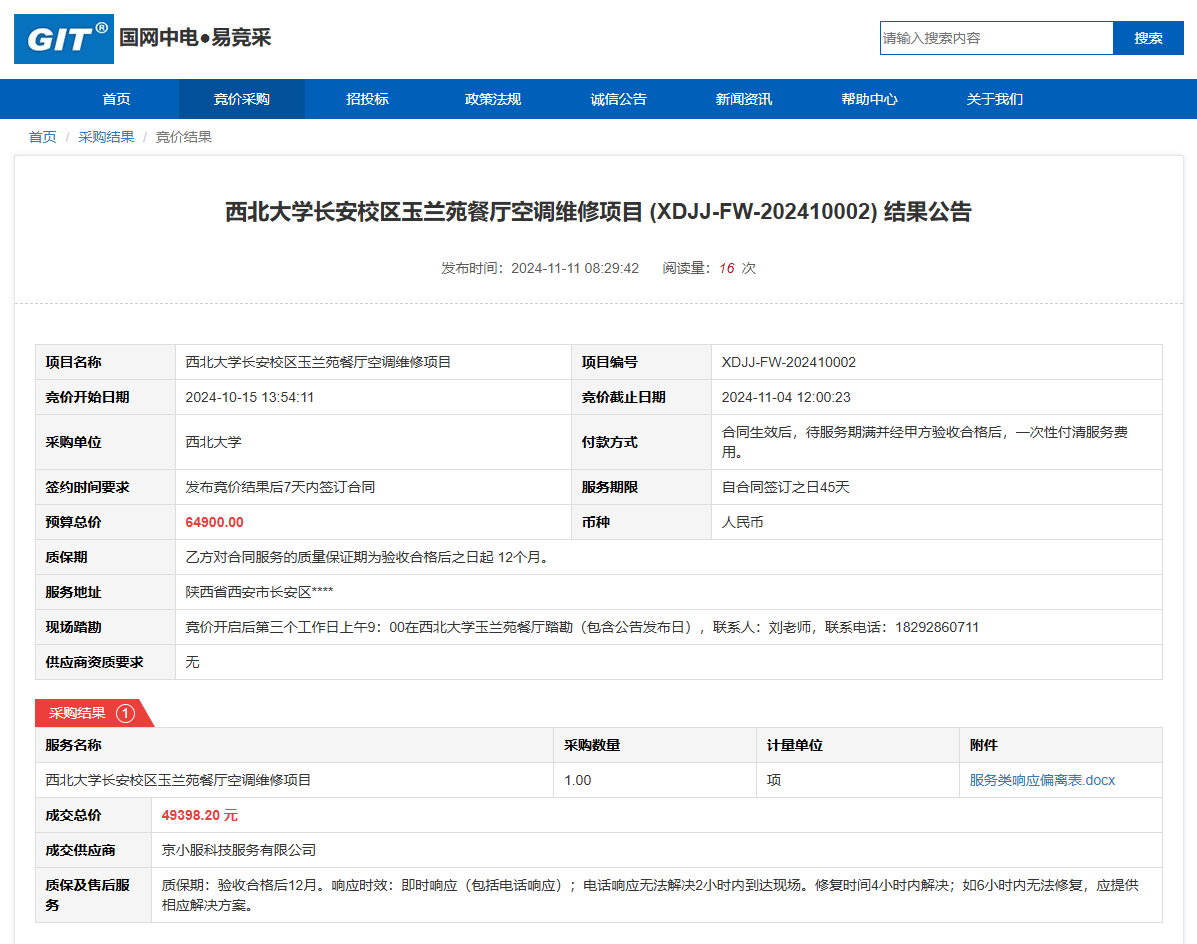 米兰买球长安校区玉兰苑餐厅空调维修项目(XDJJ-FW-202410002)竞价结果公告 作者:采购与招标办公室 编辑: 时间:2024-11-11 原公告链接:https://www.ejingcai.com.cn/site/bidding/detail/14578