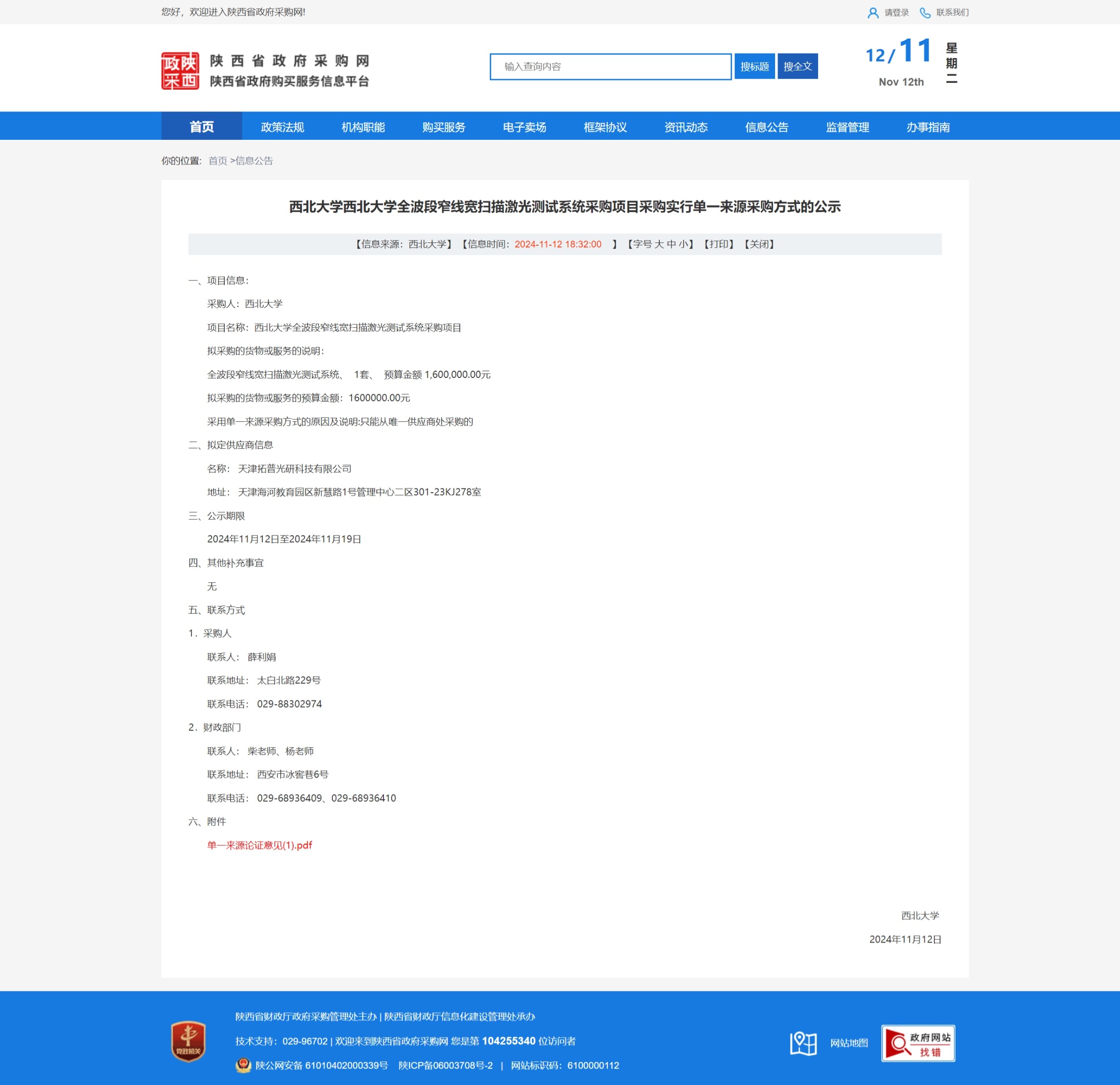 米兰买球全波段窄线宽扫描激光测试系统采购项目采购实行单一来源采购方式的公示 作者: 编辑:薛利娟 时间:2024-11-12 原公告链接:https://www.ccgp-shaanxi.gov.cn/freecms/site/shaanxi/ggxx/info/2024/8a69c24d91d6105a01931fd0fd6f6828.html?noticeType=001051¬iceId=e9c41b14-a0e2-11ef-8063-08c0eb20c666