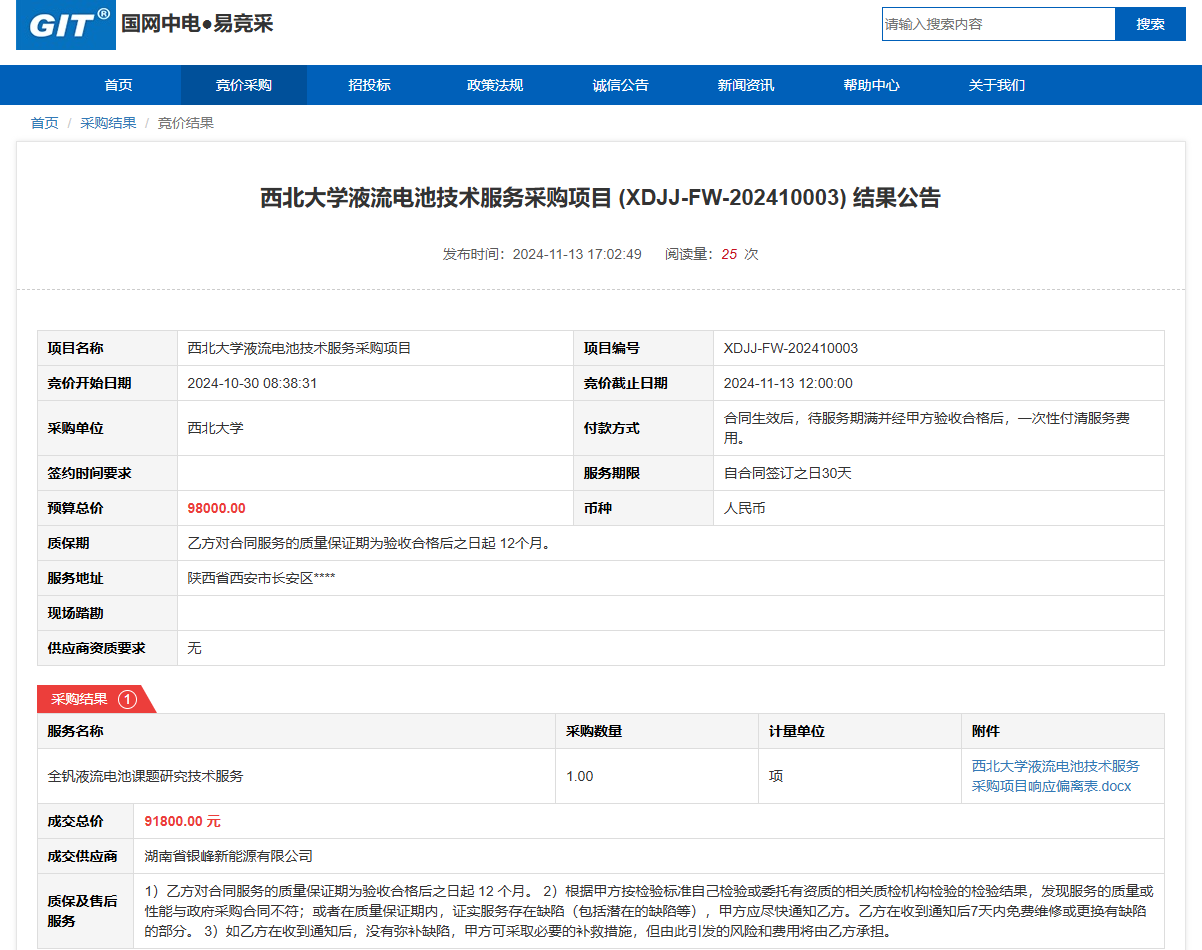 米兰买球液流电池技术服务采购项目(XDJJ-FW-202410003)竞价结果公告 作者:采购与招标办公室 编辑: 时间:2024-11-14 原公告链接:https://www.ejingcai.com.cn/site/bidding/detail/14829