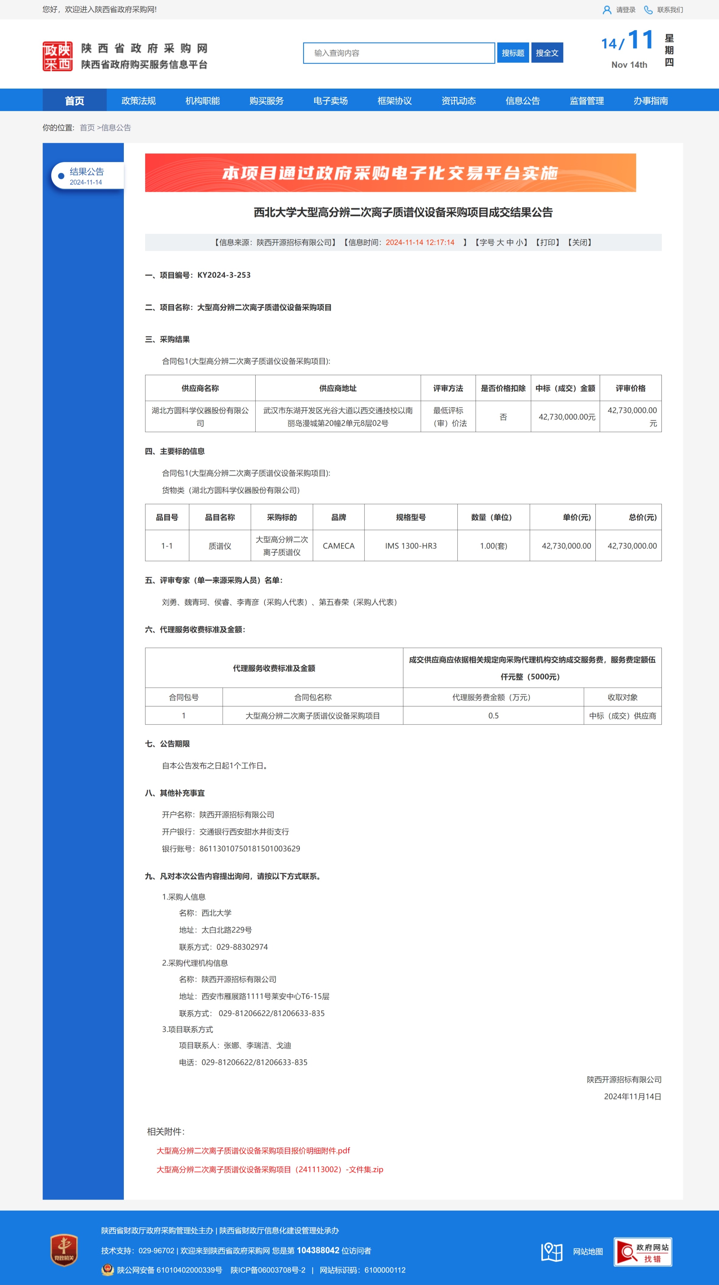 米兰买球大型高分辨二次离子质谱仪设备采购项目成交结果公告 作者: 编辑:薛利娟 时间:2024-11-14 原公告链接:https://www.ccgp-shaanxi.gov.cn/freecms/site/shaanxi/ggxx/info/2024/8a69c5a59218576d019328dcd1526537.html?noticeType=001025¬iceId=e4e285ed-a240-11ef-8063-08c0eb20c666