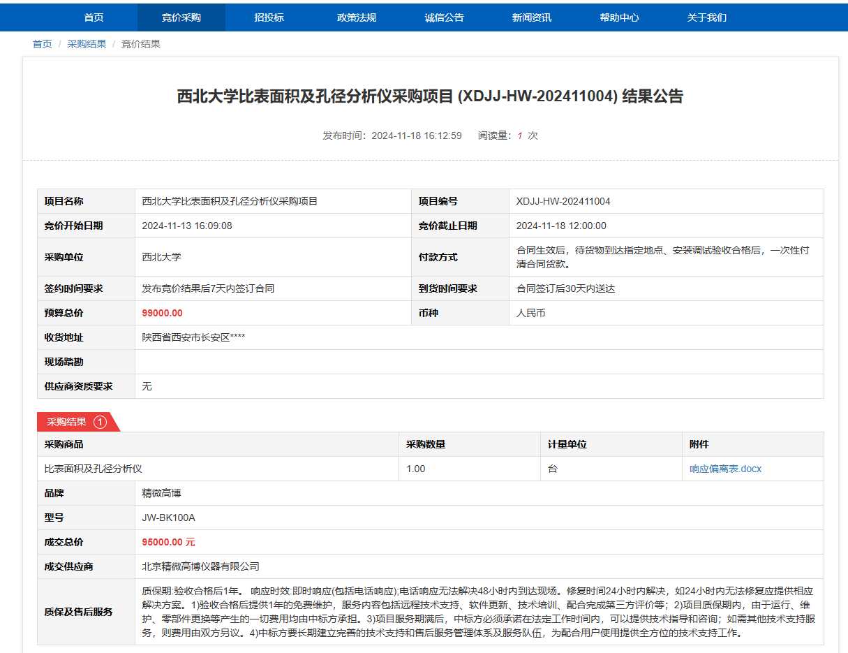 米兰买球比表面积及孔径分析仪采购项目(XDJJ-HW-202411004)竞价结果公告 作者:采购与招标办公室 编辑: 时间:2024-11-18 原公告链接:https://www.ejingcai.com.cn/site/bidding/detail/15036