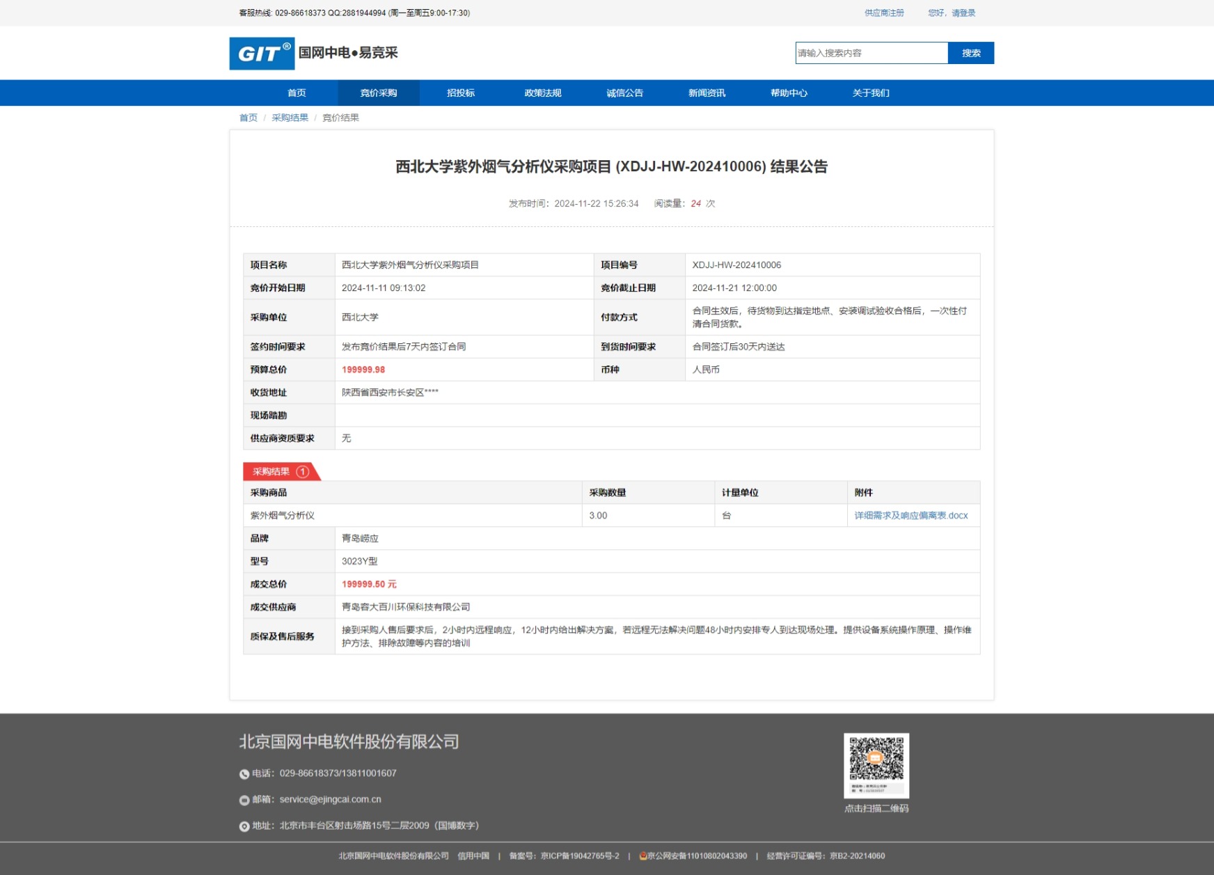 米兰买球紫外烟气分析仪采购项目 (XDJJ-HW-202410006) 结果公告 作者: 编辑:薛利娟 时间:2024-11-22 原公告链接:https://www.ejingcai.com.cn/site/bidding/detail/15251