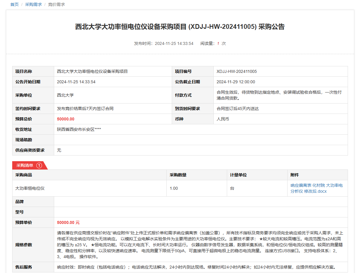 米兰买球大功率恒电位仪设备采购项目(XDJJ-HW-202411005)竞价采购公告 作者:采购与招标办公室 编辑: 时间:2024-11-25 原公告链接:https://www.ejingcai.com.cn/site/bidding/detail/15327