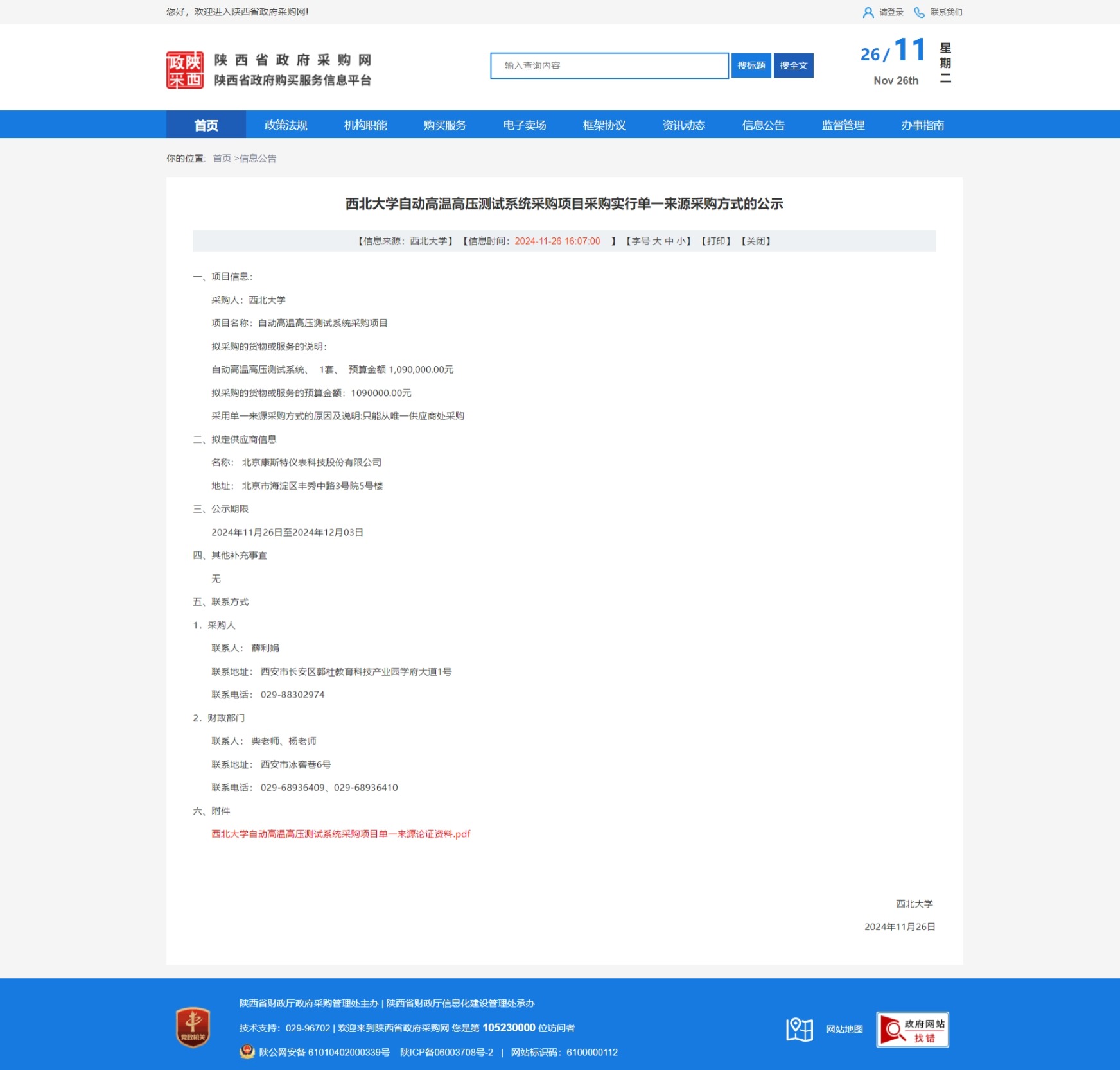 米兰买球自动高温高压测试系统采购项目采购实行单一来源采购方式的公示 作者: 编辑:薛利娟 时间:2024-11-26 原公告链接:https://www.ccgp-shaanxi.gov.cn/freecms/site/shaanxi/ggxx/info/2024/8a69c037936597080193677af75243c5.html?noticeType=001051¬iceId=008eb2b0-abcf-11ef-8063-08c0eb20c666
