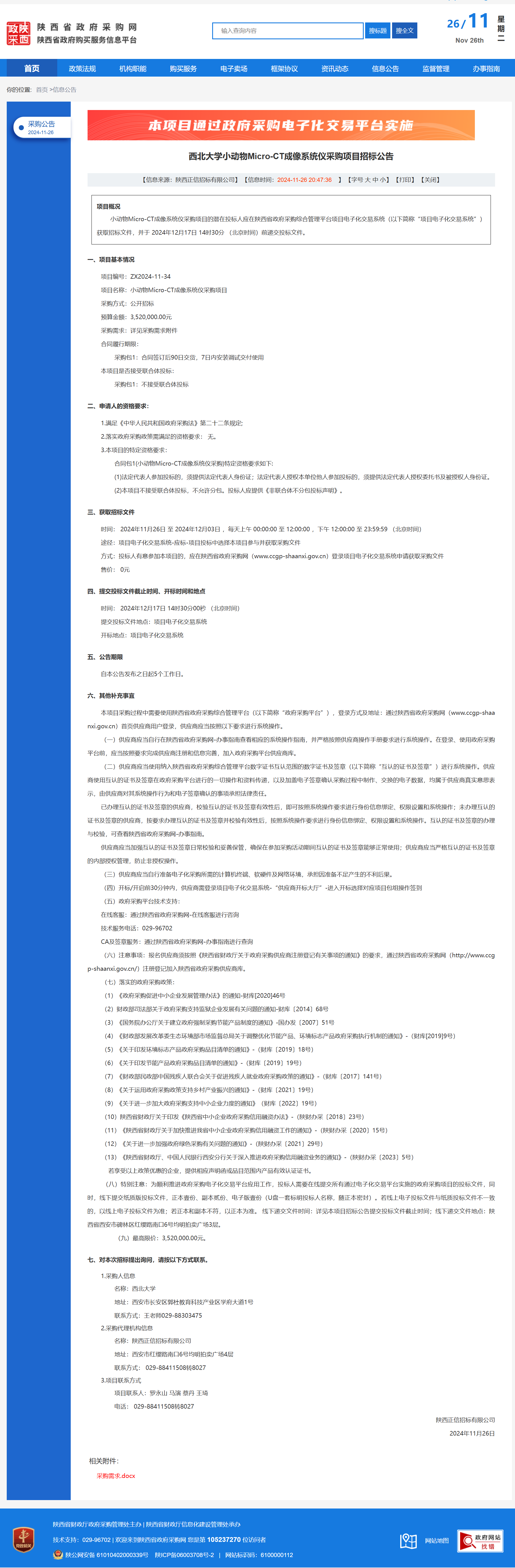 米兰买球小动物Micro-CT成像系统仪采购项目招标公告 作者:采购与招标办公室 编辑: 时间:2024-11-26 原公告链接:https://www.ccgp-shaanxi.gov.cn/freecms/site/shaanxi/ggxx/info/2024/8a69c251921857370193685963892947.html?noticeType=001011¬iceId=3436110f-abf6-11ef-8063-08c0eb20c666