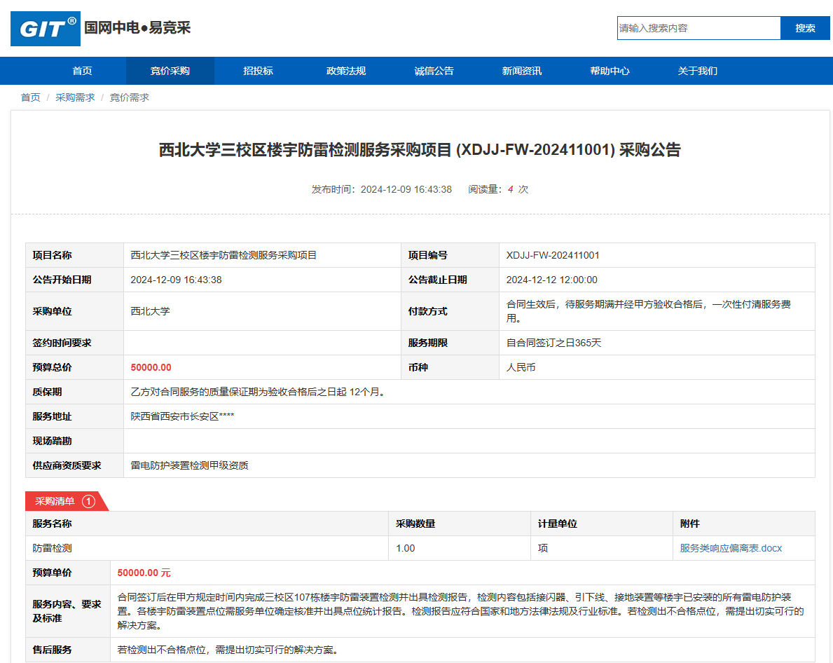 米兰买球三校区楼宇防雷检测服务采购项目(XDJJ-FW-202411001)采购公告 作者:采购与招标办公室 编辑: 时间:2024-12-09 原公告链接:https://www.ejingcai.com.cn/site/bidding/detail/15824