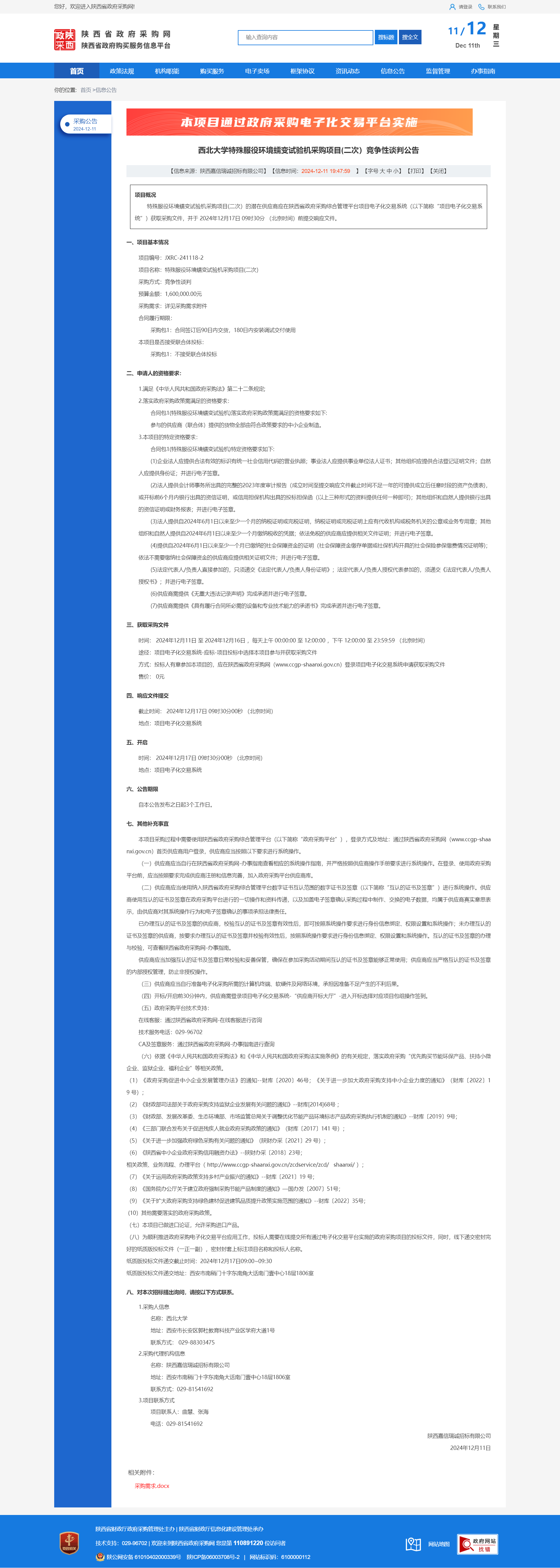 米兰买球特殊服役环境蠕变试验机采购项目(二次)竞争性谈判公告 作者:采购与招标办公室 编辑: 时间:2024-12-11 原公告链接:https://www.ccgp-shaanxi.gov.cn/freecms/site/shaanxi/ggxx/info/2024/8a69c5a59218576d0193b572f0492761.html?noticeType=001013¬iceId=632dd20f-b7b7-11ef-8063-08c0eb20c666