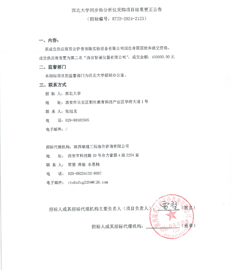 米兰买球同步热分析仪采购项目结果更正公告
