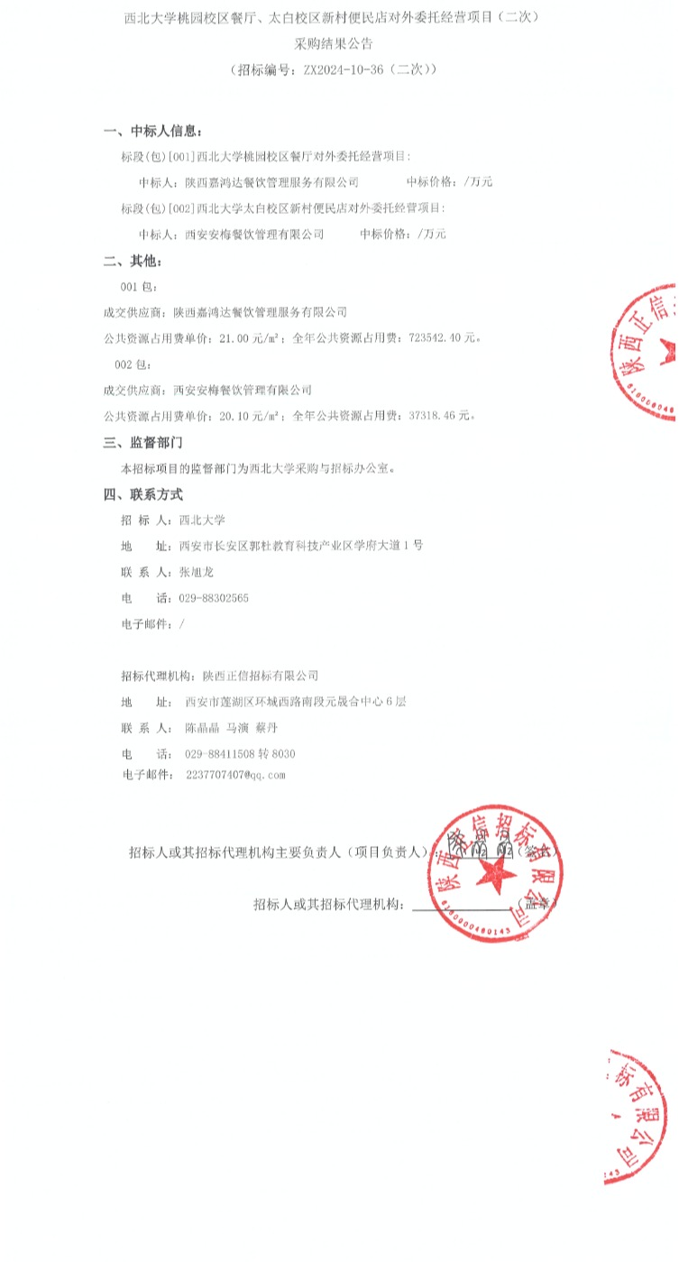 米兰买球桃园校区餐厅、太白校区新村便民店对外委托经营项目(二次)采购结果公告