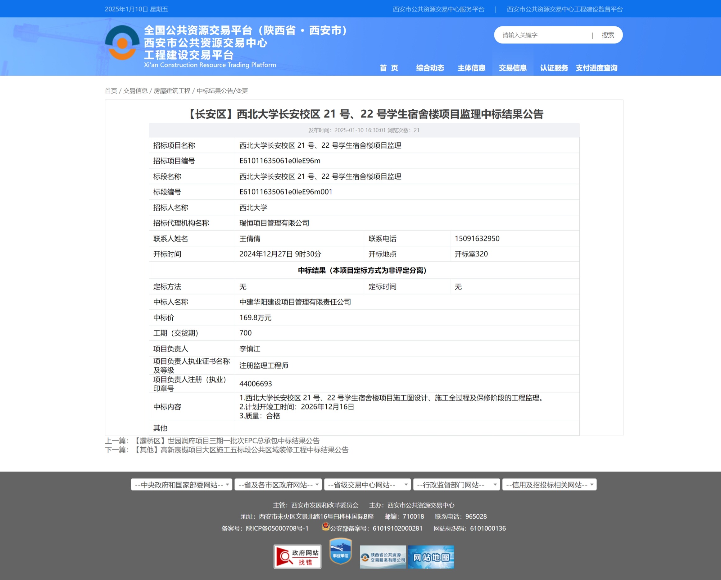 米兰买球长安校区 21 号、22 号学生宿舍楼项目监理中标结果公告