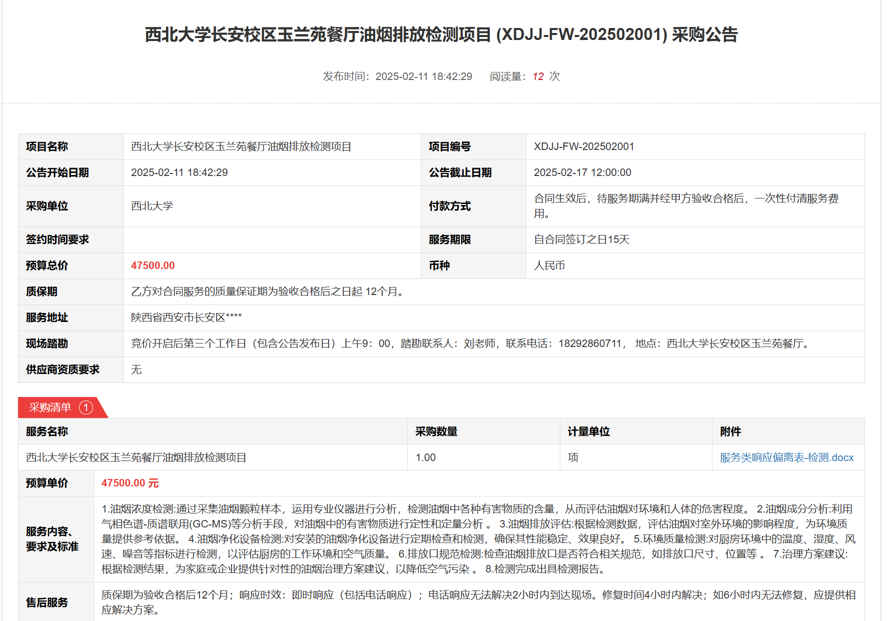 米兰买球长安校区玉兰苑餐厅油烟排放检测项目(XDJJ-FW-202502001)竞价采购公告 作者:采购与招标办公室 编辑: 时间:2025-02-11 原公告链接:https://www.ejingcai.com.cn/site/bidding/detail/16498