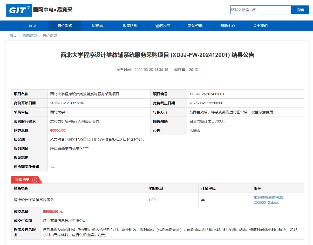 米兰买球程序设计类教辅系统服务采购项目(XDJJ-FW-202412001)竞价结果公告 作者:采购与招标办公室 编辑: 时间:2025-03-20 原公告链接:https://www.ejingcai.com.cn/site/bidding/detail/17064