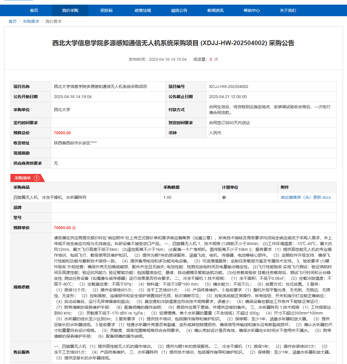 米兰买球信息学院多源感知通信无人机系统采购项目(XDJJ-HW-202504002)竞价采购公告 作者:采购与招标办公室 编辑: 时间:2025-04-16 原公告链接:https://www.ejingcai.com.cn/site/bidding/detail/17703
