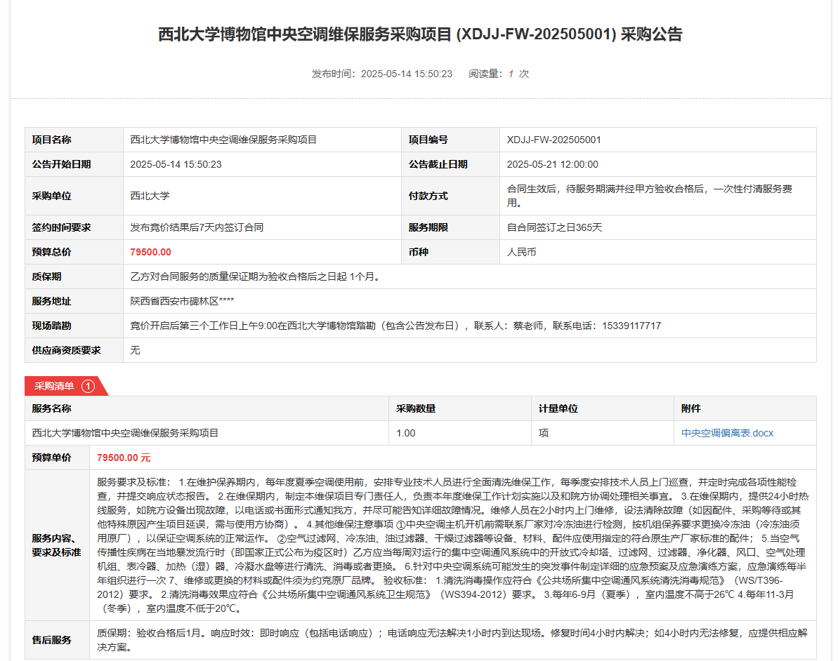 米兰买球博物馆中央空调维保服务采购项目(XDJJ-FW-202505001)竞价采购公告 作者:采购与招标办公室 编辑: 时间:2025-05-14 原公告链接:https://www.ejingcai.com.cn/site/bidding/detail/18217