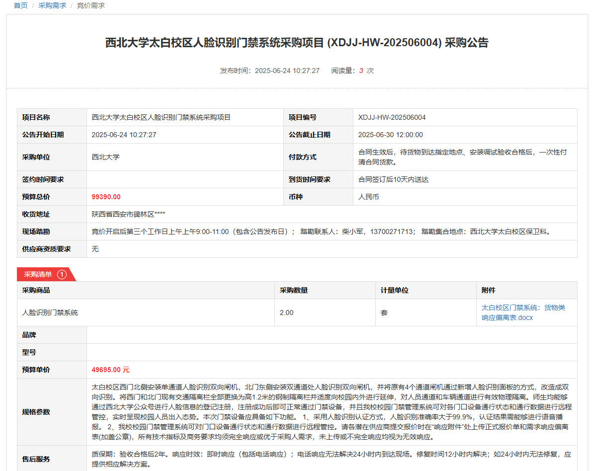 米兰买球太白校区人脸识别门禁系统采购项目(XDJJ-HW-202506004)竞价采购公告 作者: 编辑: 时间:2025-06-24 原公告链接:https://www.ejingcai.com.cn/site/bidding/detail/19128