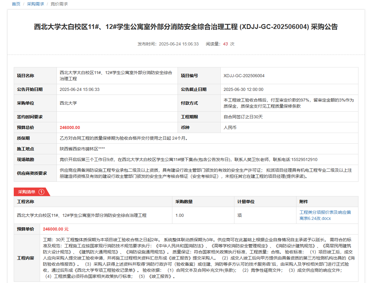 米兰买球太白校区11#、12#学生公寓室外部分消防安全综合治理工程(XDJJ-GC-202506004)竞价采购公告 作者:采购与招标办公室 编辑: 时间:2025-06-25 原公告链接:https://www.ejingcai.com.cn/site/bidding/detail/19136