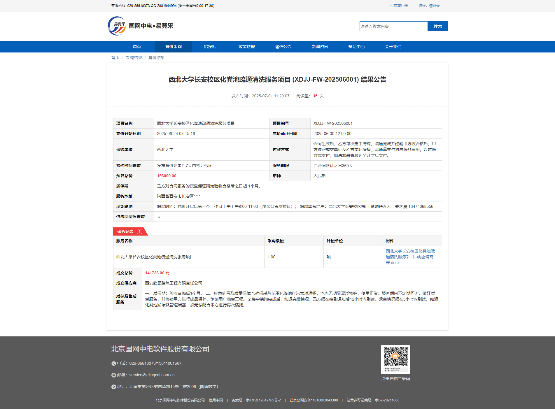 米兰买球长安校区化粪池疏通清洗服务项目 (XDJJ-FW-202506001) 结果公告