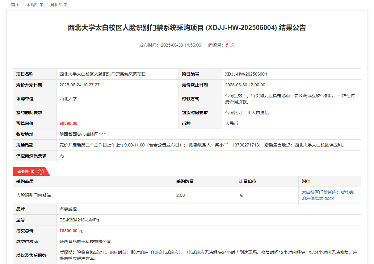 米兰买球太白校区人脸识别门禁系统采购项目(XDJJ-HW-202506004)竞价结果公告 作者:采购与招标办公室 编辑: 时间:2025-06-30 原公告链接:https://www.ejingcai.com.cn/site/bidding/detail/19250