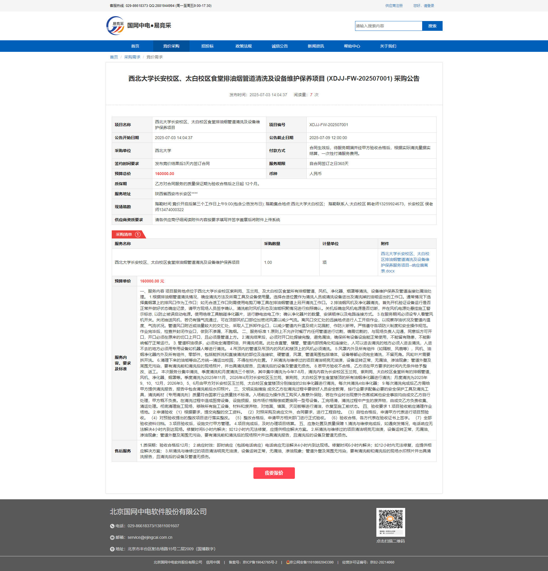 米兰买球长安校区、太白校区食堂排油烟管道清洗及设备维护保养项目 (XDJJ-FW-202507001) 采购公告