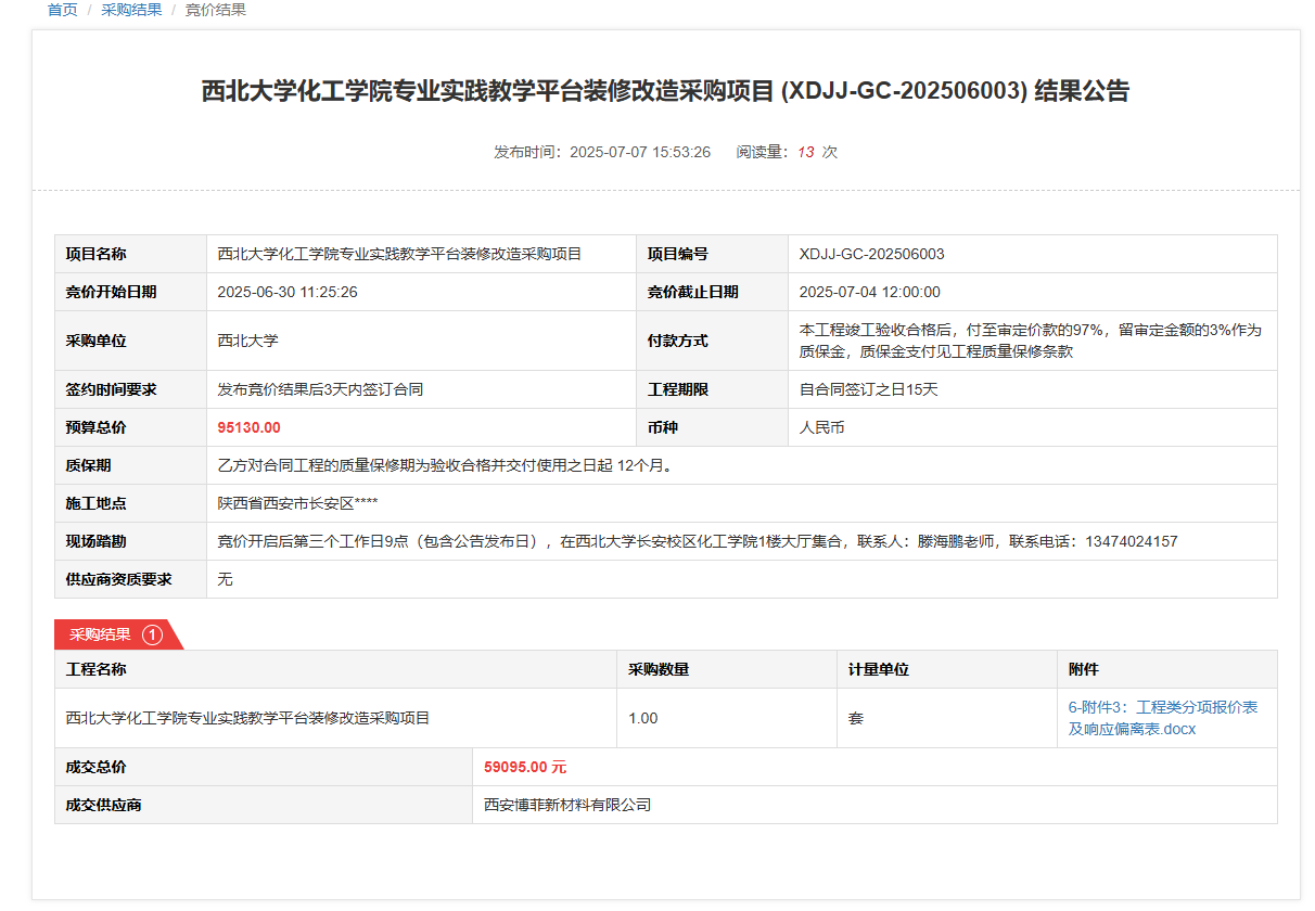 米兰买球化工学院专业实践教学平台装修改造采购项目(XDJJ-GC-202506003)竞价结果公告
