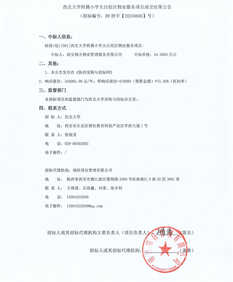 米兰买球附属小学太白校区物业服务项目成交结果公告